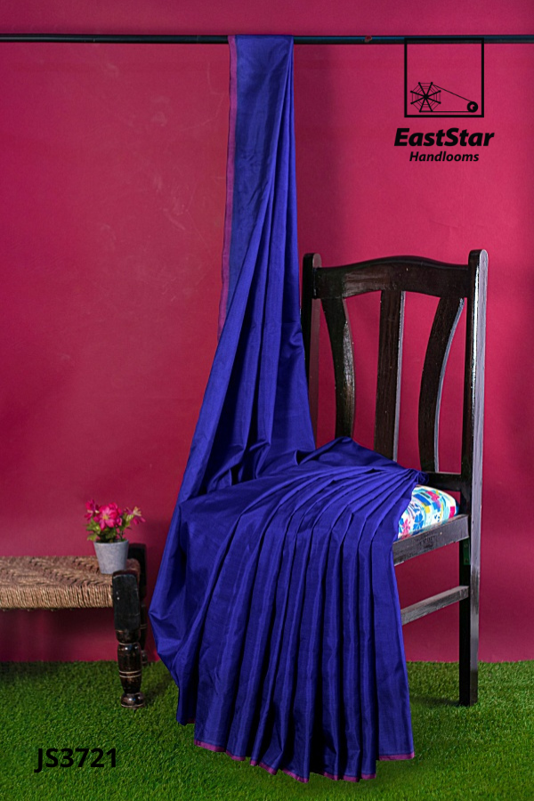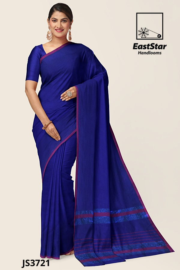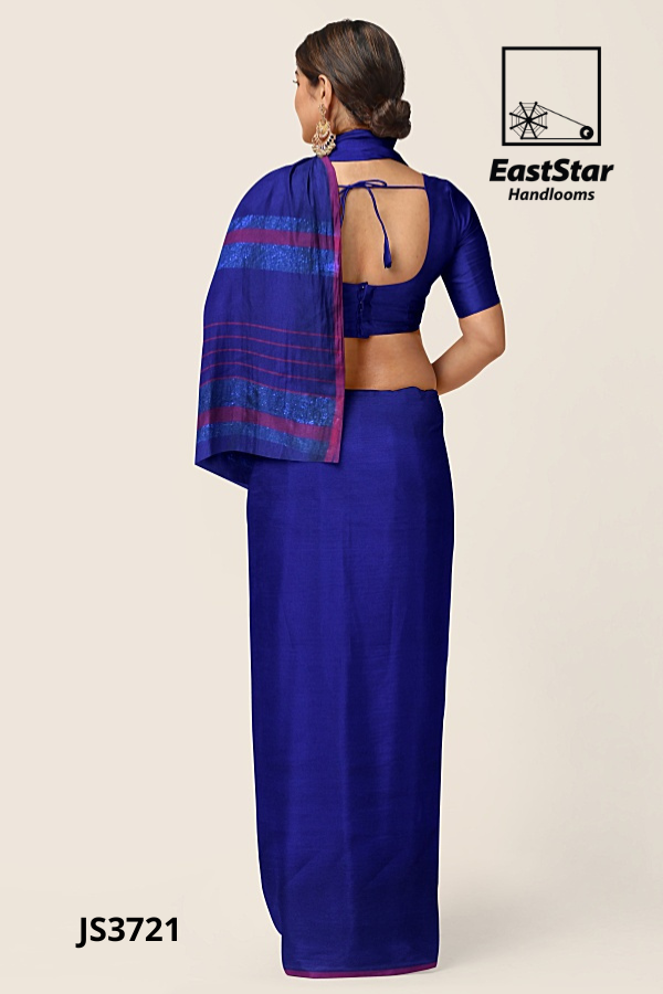 Step into luminous elegance with the Royal blue saree EastStar Handlooms JS3721—a Handloom royal blue saree designed to captivate. Its deep royal blue drape is framed by a refined maroon border with contrast piping, creating a Royal blue saree maroon border statement; the pallu showcases blue saree striped pallu accents with two shimmering blue bands divided by a rich maroon band and delicate maroon lines. Paired with a matching short-sleeve blouse, this Blue saree maroon border EastStar Handlooms piece flows from ceremony to soirée with poised sophistication. Make it yours now: Buy royal blue handloom saree, Order blue saree maroon border, and Buy blue saree contrast piping from EastStar Handlooms for heritage quality that turns heads.