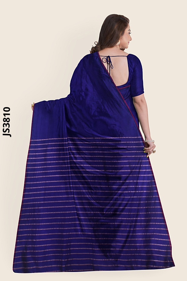Step into effortless elegance with Royal Blue Sari JS3810, a royal blue striped sari boasting royal blue sari magenta border finesse and a metallic, striped pallu that flashes soft pink-gold and lavender hues with every move. The pallu fans out in fine horizontal lines, while the matching sweetheart neckline blouse sari, short-sleeved and beautifully contoured, frames your confidence. Refined yet radiant, this striped pallu sari JS3810 and Sweetheart blouse sari JS3810 bring catalog-worthy polish to weddings, soirees, and festive nights. Buy royal blue sari online and order this royal blue border sari today; it’s the standout striped pallu blue sari and sweetheart neckline blouse matching sari you’ve been waiting for.