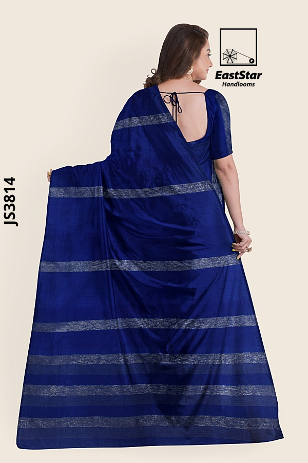 Drape yourself in luminous elegance with Royal blue silver border saree JS3814, a smooth shiny finish blue saree JS3814 and deep royal blue border saree that flatters every silhouette. The royal blue saree metallic border and matching edge frame the look, while the deep royal blue striped pallu JS3814 with parallel silver lines adds modern polish to this striped pallu blue saree. Effortlessly styled with a short-sleeve blouse and delicate jewelry, this shiny finish royal blue saree moves from festive nights to refined daytime events with ease. Buy royal blue border saree with confidence—order shiny finish blue saree now and buy striped pallu blue saree you will reach for again and again.