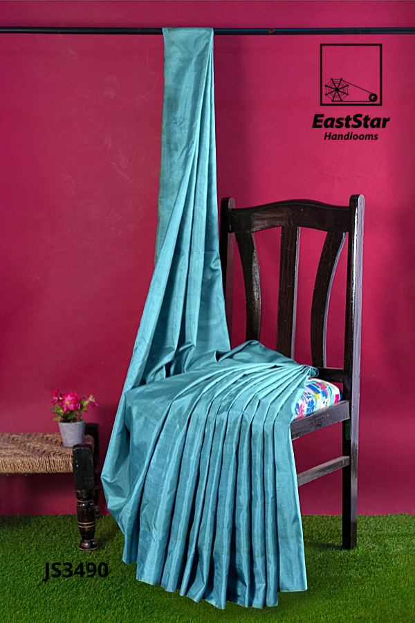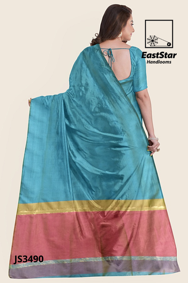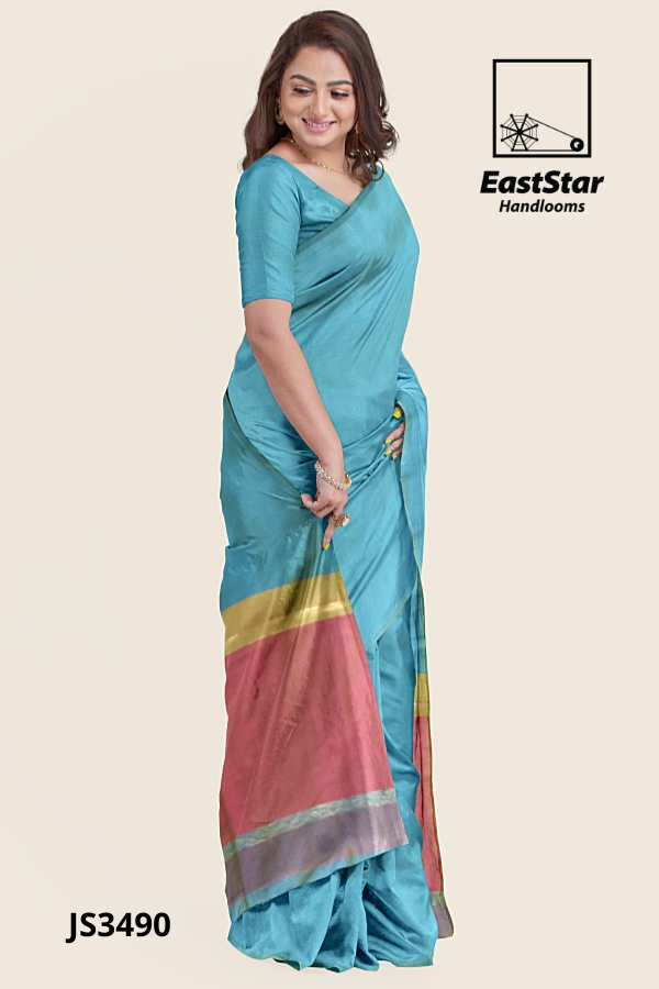 Unveil timeless grace with EastStar Handlooms JS3490, a teal blue silk-like handloom saree that drapes fluidly and gleams with refined luster. Its color block pallu commands attention: mustard-gold, dusty-rose, and grayish-lavender bands, finished with a sleek metallic silver border and teal edging. Lightweight, smooth, and impeccably woven, this color block pallu traditional saree transitions from celebrations to evening elegance, pairing beautifully with gold-toned jewelry. Shop this teal blue silk like saree online from EastStar Handlooms and make it yours today if you want to buy a teal blue handloom saree, order a color block pallu saree, or own a handloom saree with metallic border; the color block pallu saree by EastStar Handlooms you will reach for again.