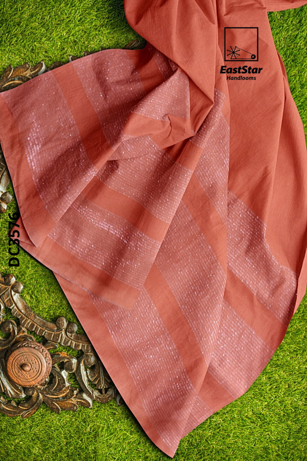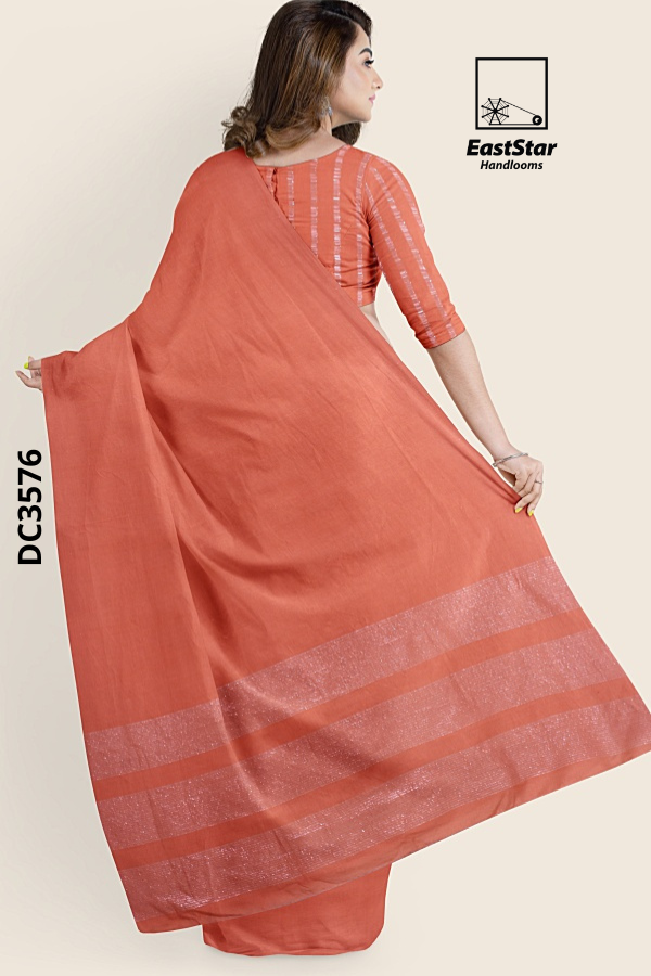 Discover the refined warmth of EastStar Handlooms with DC3576, a rust/terracotta-orange handloom saree crafted in a sophisticated plain matte finish. Soft front pleats flow into a graceful, long pallu detailed with three wide, subtly shimmery translucent bands that add a whisper of glow—perfect for those who love a rust saree with shimmery bands and an elegant, effortless drape. Versatile and timeless, this terracotta orange plain matte saree styles beautifully with a striped blouse or minimalist jewels, making it your go-to rust orange handloom saree for celebrations, work, and everything in between. Buy rust handloom saree online from EastStar Handlooms—this terracotta orange saree EastStar favorite won’t last; order the DC3576 EastStar Handlooms saree now and buy a plain matte handloom saree you’ll reach for again and again