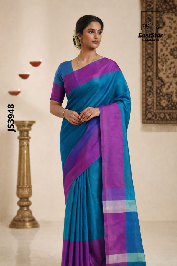 This saree (JS3948) features a beautiful teal blue body paired with a rich purple border and pallu, creating an elegant and timeless contrast. Made from a soft handloom cotton or cotton-silk blend, it offers a smooth texture and comfortable drape ideal for all-day wear. The design is minimal and classy, with a plain body and a subtly patterned pallu highlighted by soft silver and light blue stripes. It comes with a matching teal blouse accented with a purple sleeve border, completing the refined look. Perfect for office wear, casual outings, or traditional occasions, this saree blends simplicity with a premium aesthetic