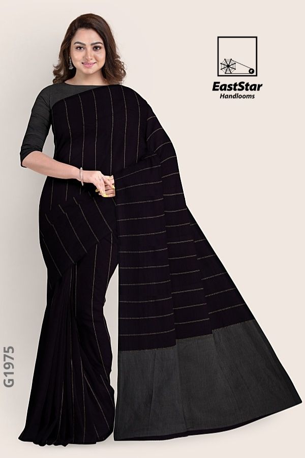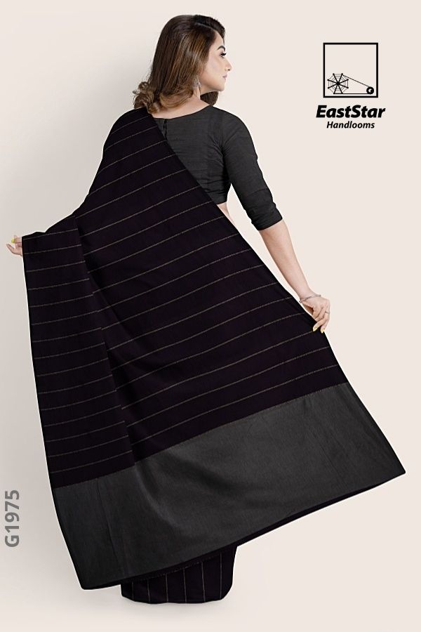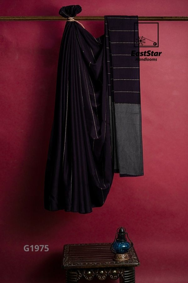 If you are looking for a fine outfit for work, this is another stunning piece! The East Star handloom Glossy cotton saree is woven with Love, but intricate motifs all over the body. This Violet with Grey Stripes of the saree completes the look. Wear it with handmade Jewelry and sandals to ace the perfect board room look. Grey blouse is as it\’s Shown in the Picture.