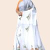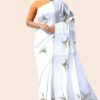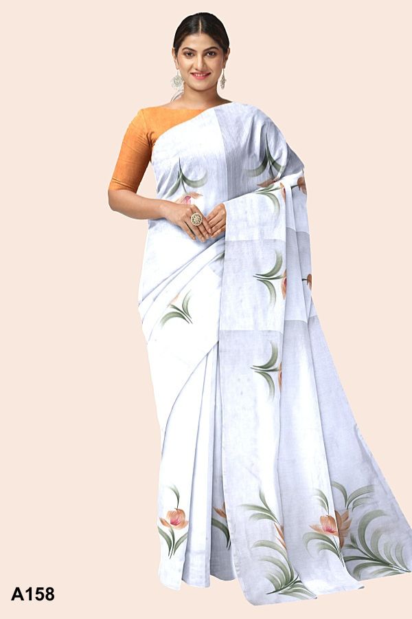 Impress with our White floral motif saree, exhibiting delicate peach and green accents. The mesmerizing combination of the white saree and contrasting orange short-sleeved blouse echoes traditional Indian elegance. Stand out with the subtle floral design, complemented by your included silver accessories. This fashionable ethnic wear is available online. Invoke admiration with the charm of this designer Indian saree and matching orange blouse. Shop our floral print white saree today – the epitome of style and grace. Explore our stock and buy this white saree online now. Secure your saree with an orange blouse order and dazzle at your next event. Purchase this exquisite white floral saree online and experience the luxury.