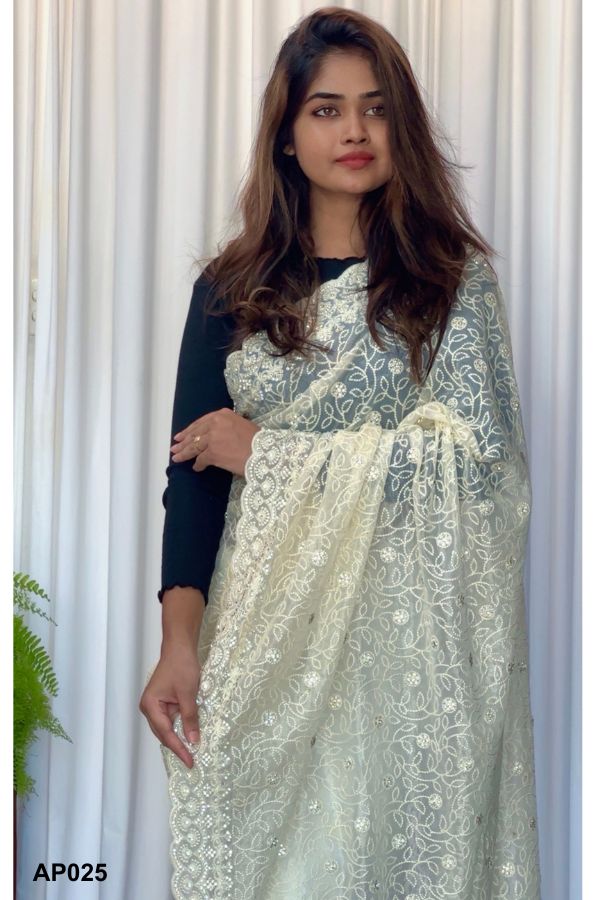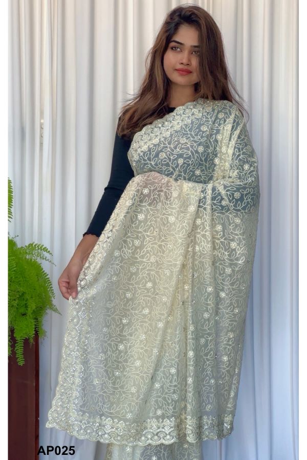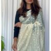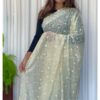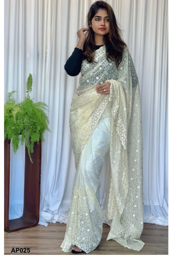 Step into a world of timeless elegance with our White and Silver Floral Saree, a masterpiece from our Silver Floral Saree Collection. This exquisite piece is meticulously crafted with intricate embellishments, making it a stunning addition to any wardrobe. The saree drapes effortlessly over the elegant black blouse, showcasing a sophisticated contrast that enhances its luxurious appeal. Perfect for those who appreciate Elegant Indian Saree Designs, this designer floral patterned saree elevates any occasion with grace and charm. Dont miss the chance to own a piece of art that blends traditional artistry with modern style. Buy white silver floral saree today and experience the allure of designer couture, all available at our Luxury Designer Sarees Online store.